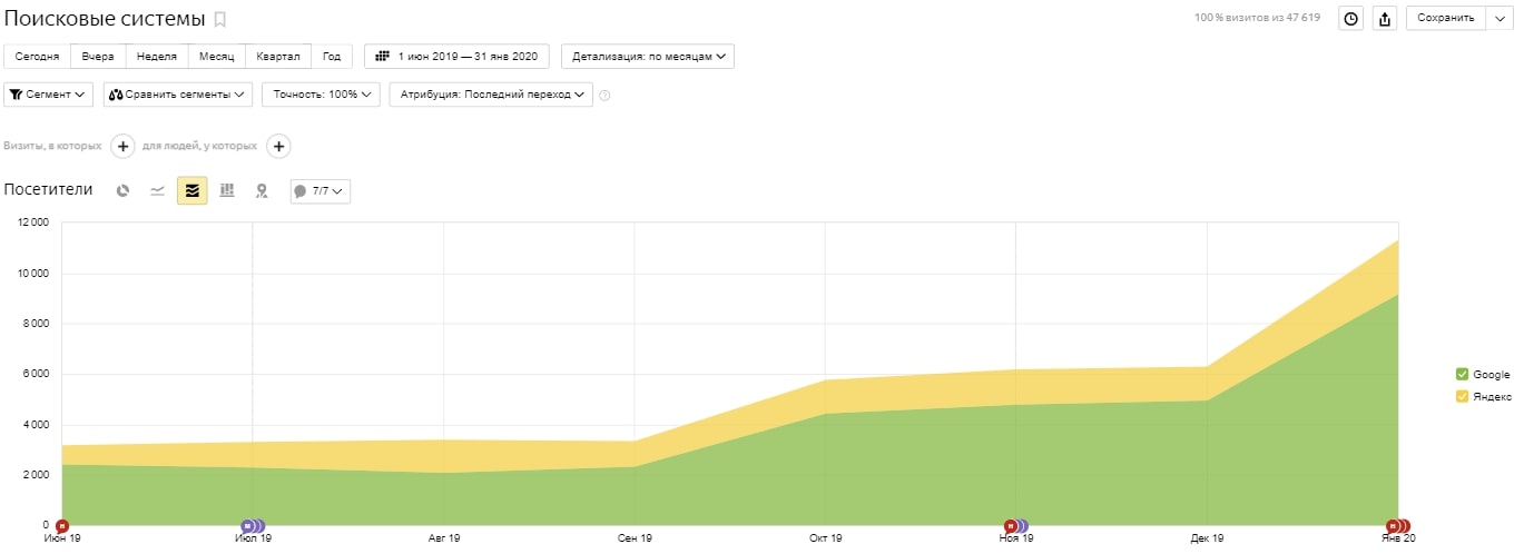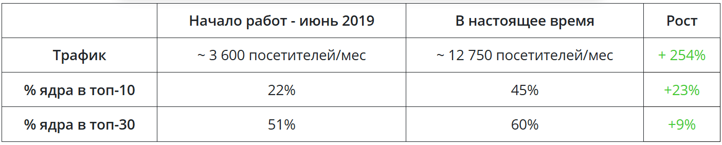 С начала сотрудничества (июнь 2019) за месяц обеспечен прирост ЛИДов на 40% при том же бюджете (более 1.5 млн). Рост органического трафика в 5 раз за полгода. Выросли заявки с сайта без увеличения рекламного бюджета. Прирост первичных посетителей 236%.